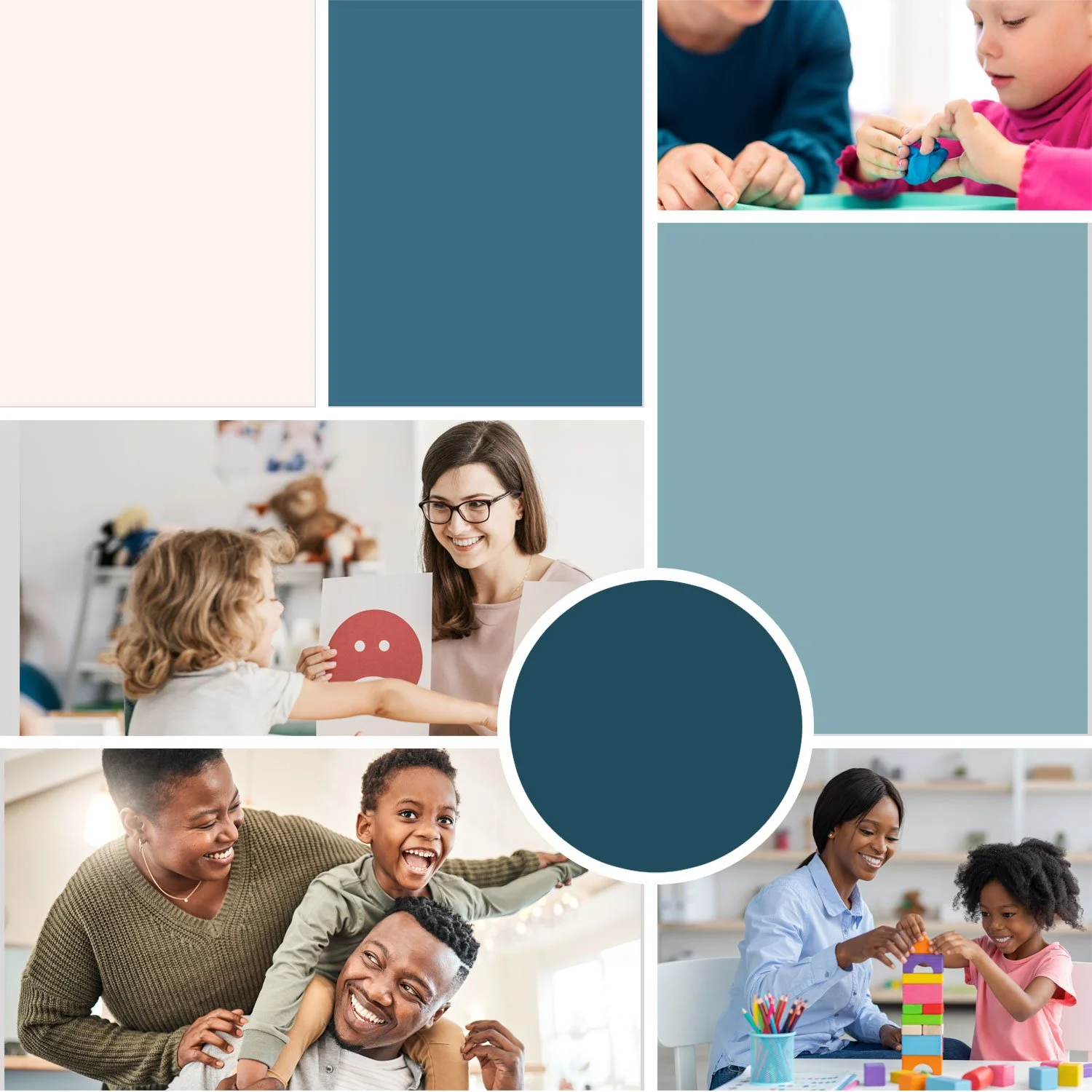 A sensory-friendly palette of muted blues, sage, and off-white creates a calm emotional tone without feeling overly clinical or overstimulating.